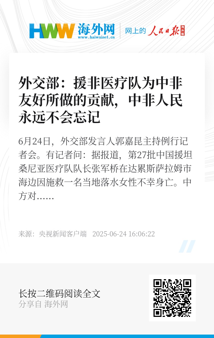 6月24日,外交部发言人郭嘉昆主持例行记者会。有记者问:据报道,第27批中国援坦桑尼亚医疗队队长张军桥在达累斯萨拉姆市海边因施救一名当地落水女性不幸身亡。中方对此有何评论?