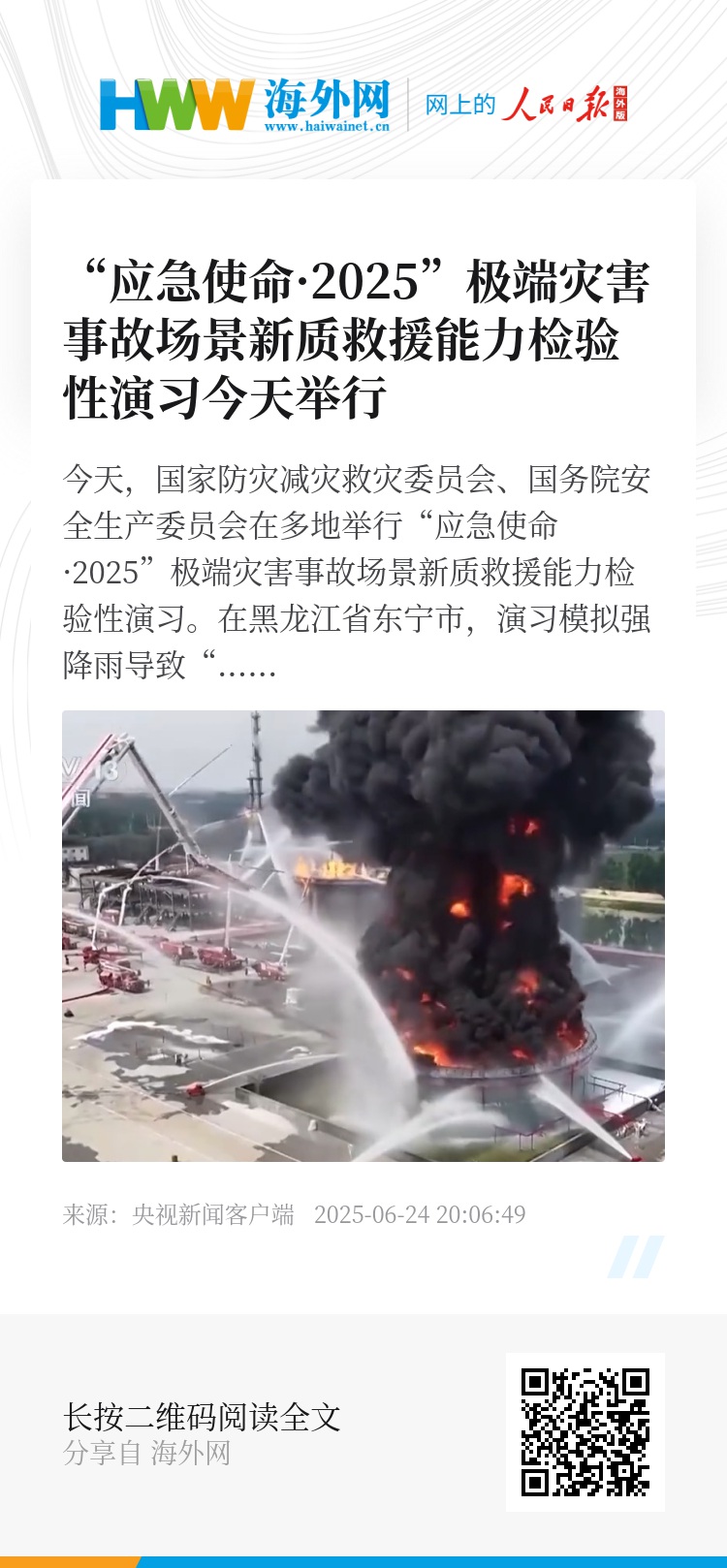 今天,国家防灾减灾救灾委员会、国务院安全生产委员会在多地举行“应急使命·2025”极端灾害事故场景新质救援能力检验性演习。