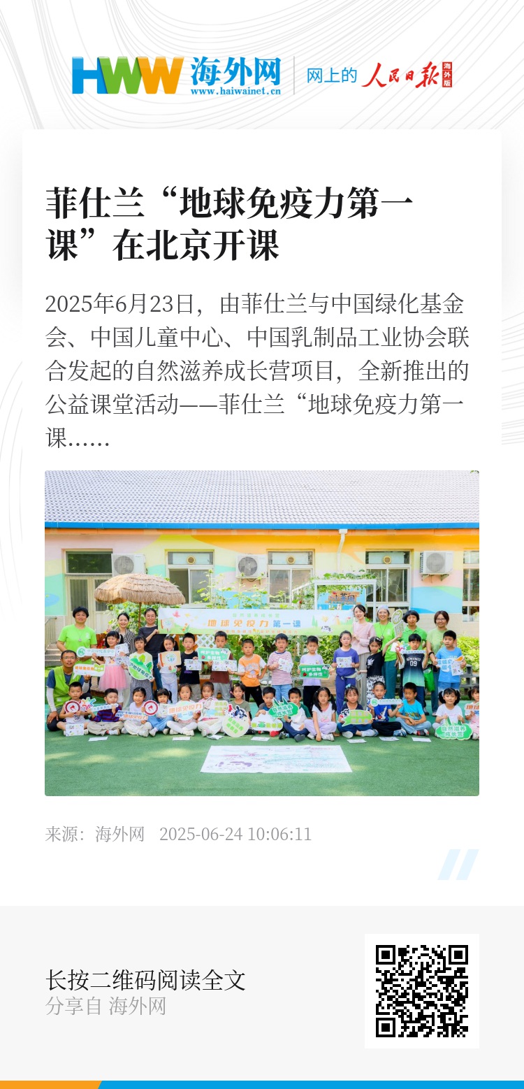2025年6月23日,由菲仕兰与中国绿化基金会、中国儿童中心、中国乳制品工业协会联合发起的自然滋养成长营项目,全新推出的公益课堂活动——菲仕兰“地球免疫力第一课”在北京理工大学幼儿园试点开课。本课程在专家指导下,由专业自然教育机构开发,旨在启发儿童对自然的感知力,激发保护地球生态的责任感,树立人与自然和谐共生的可持续发展理念。