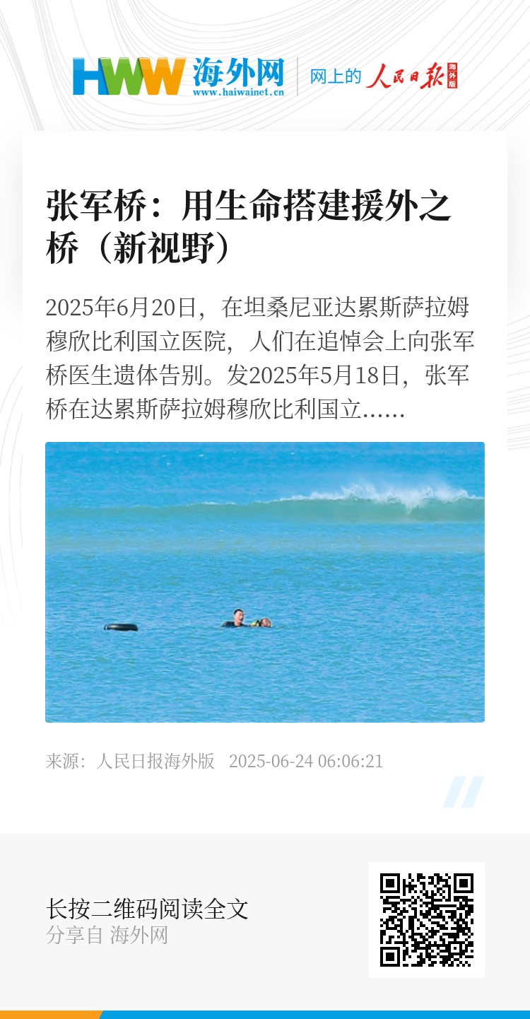 6月15日,一名坦桑尼亚女子在达累斯萨拉姆市海边溺水。中国援助坦桑尼亚医疗队队长张军桥毫不犹豫跃入海中施救。在落水者获救上岸后,张军桥因体力透支溺水,虽经抢救,仍不幸离世,年仅38岁。