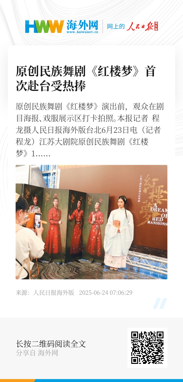 人民日报海外版台北6月23日电(记者程龙)江苏大剧院原创民族舞剧《红楼梦》19日至22日一连四天在台北表演艺术中心上演,约6000名观众走进剧院,现场感受中华传统美学的深厚底蕴与独特魅力。
