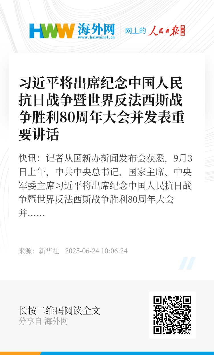 新华社快讯:记者从国新办新闻发布会获悉,9月3日上午,中共中央总书记、国家主席、中央军委主席习近平将出席纪念中国人民抗日战争暨世界反法西斯战争胜利80周年大会并发表重要讲话。