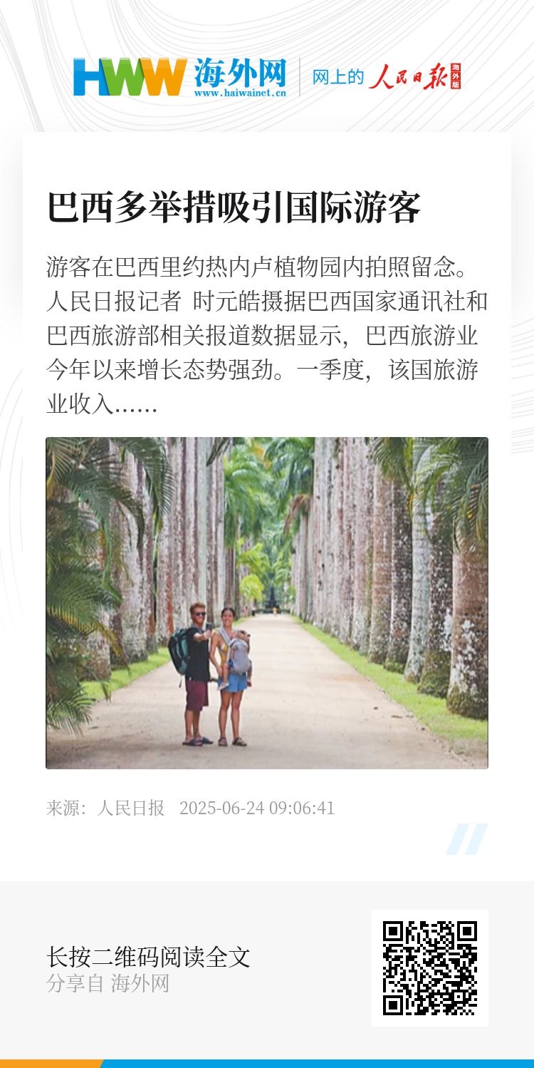 据巴西国家通讯社和巴西旅游部相关报道数据显示,巴西旅游业今年以来增长态势强劲。一季度,该国旅游业收入达554亿雷亚尔(1雷亚尔约合1.3元人民币),同比增长5.8%;累计接待国际游客约374万人次,创下历年最佳成绩。巴西旅游部部长塞尔索·萨比诺表示,当前旅游业的优异表现,预示着今年到访巴西的国际游客数量有望再创新高。巴西国际旅游促进局局长马塞洛·弗雷索表示:“创纪录的国际游客数量,不仅有力拉动了巴西经济增长,为旅游市场注入新活力,更为巴西民众创造大量就业机会,带来实实在在的收入。”