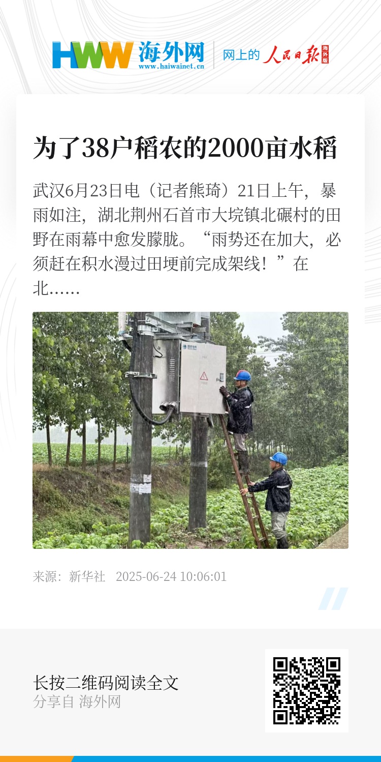 新华社武汉6月23日电(记者熊琦)21日上午,暴雨如注,湖北荆州石首市大垸镇北碾村的田野在雨幕中愈发朦胧。“雨势还在加大,必须赶在积水漫过田埂前完成架线!”在北碾村东河头八组,电工祁剑的呼喊声穿透雨幕。
