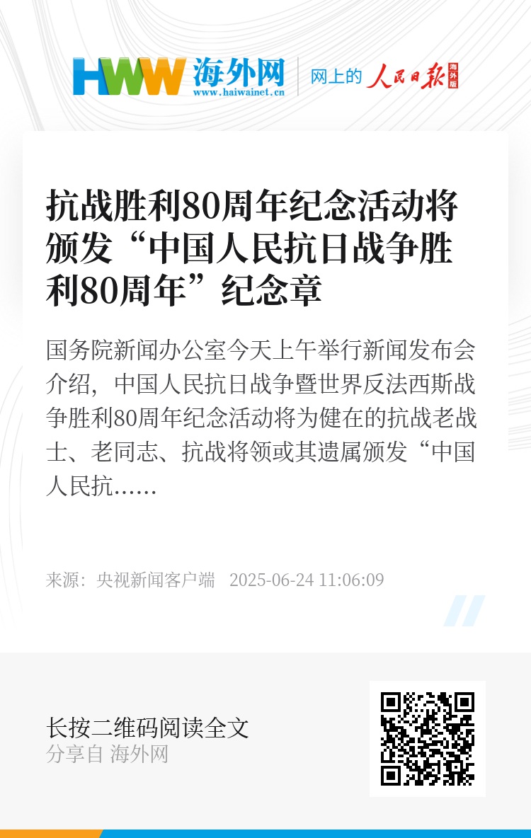 国务院新闻办公室今天上午举行新闻发布会介绍,中国人民抗日战争暨世界反法西斯战争胜利80周年纪念活动将为健在的抗战老战士、老同志、抗战将领或其遗属颁发“中国人民抗日战争胜利80周年”纪念章。各地区各有关部门将组织对国内健在的抗战老战士、老同志、抗战将领或其遗属、抗战烈士亲属的慰问活动。