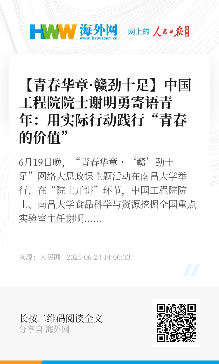 6月19日晚,“青春华章・‘赣’劲十足”网络大思政课主题活动在南昌大学举行,在“院士开讲”环节,中国工程院院士、南昌大学食品科学与资源挖掘全国重点实验室主任谢明勇面向现场青年学子,发出殷切寄语。(孔文进)
