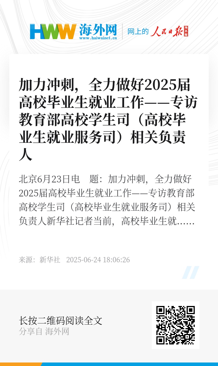 新华社北京6月23日电 题:加力冲刺,全力做好2025届高校毕业生就业工作——专访教育部高校学生司(高校毕业生就业服务司)相关负责人