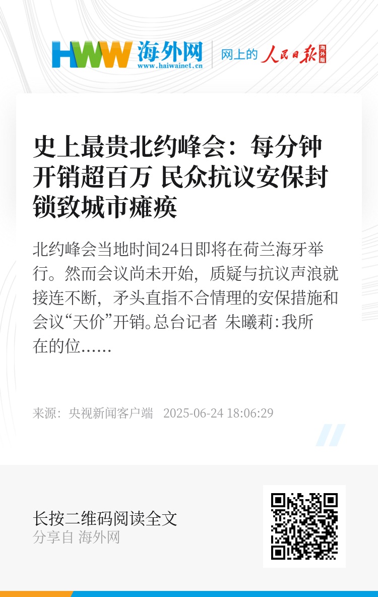 总台记者 朱曦莉:与此同时,峰会的“天价”成本也引发大量质疑声。荷兰政府的数据显示,本次峰会总费用高达1.834亿欧元,折算下来每分钟开销超100万欧元,堪称史上最昂贵的北约峰会。海牙市民普遍质疑,这样的高额开支是否花得值得。