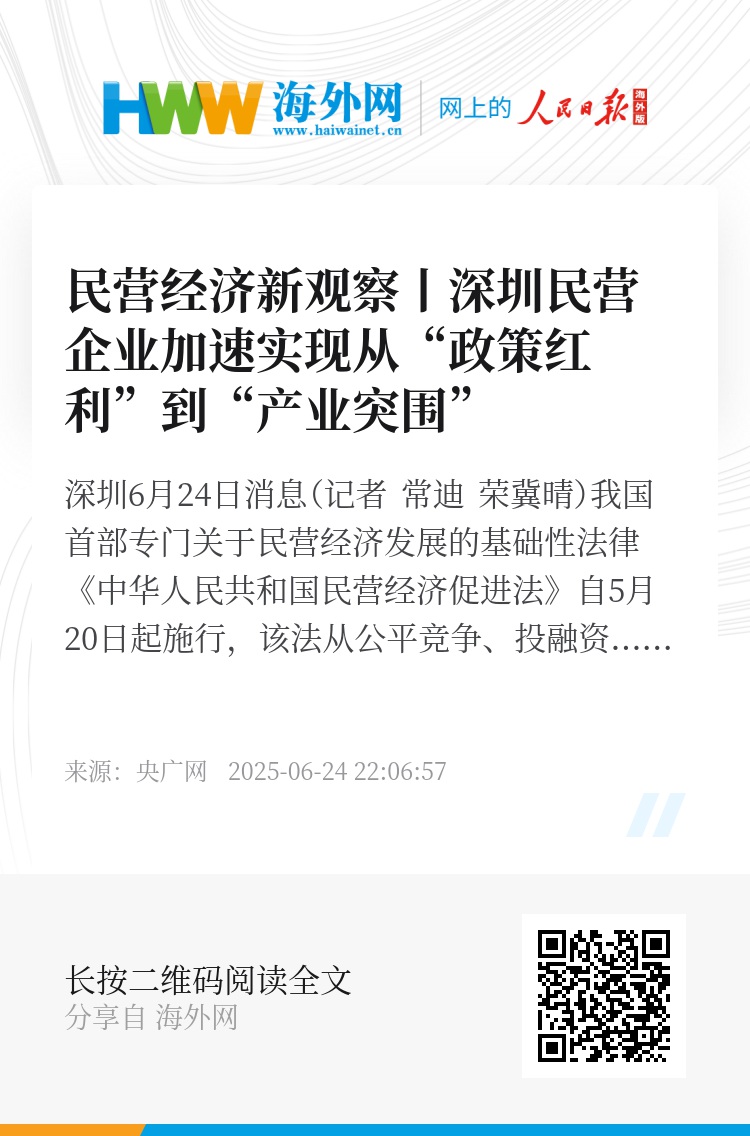 央广网深圳6月24日消息(记者 常迪 荣冀晴)我国首部专门关于民营经济发展的基础性法律《中华人民共和国民营经济促进法》自5月20日起施行,该法从公平竞争、投融资促进、科技创新等多个维度精准发力,既保障民营经济组织平等参与市场竞争、合法权益不受侵害,又引导企业规范经营、履行社会责任。对此,记者采访了深圳市发展和改革委员会及深圳多家民营企业负责人,了解他们对该法出台后的看法与期待。