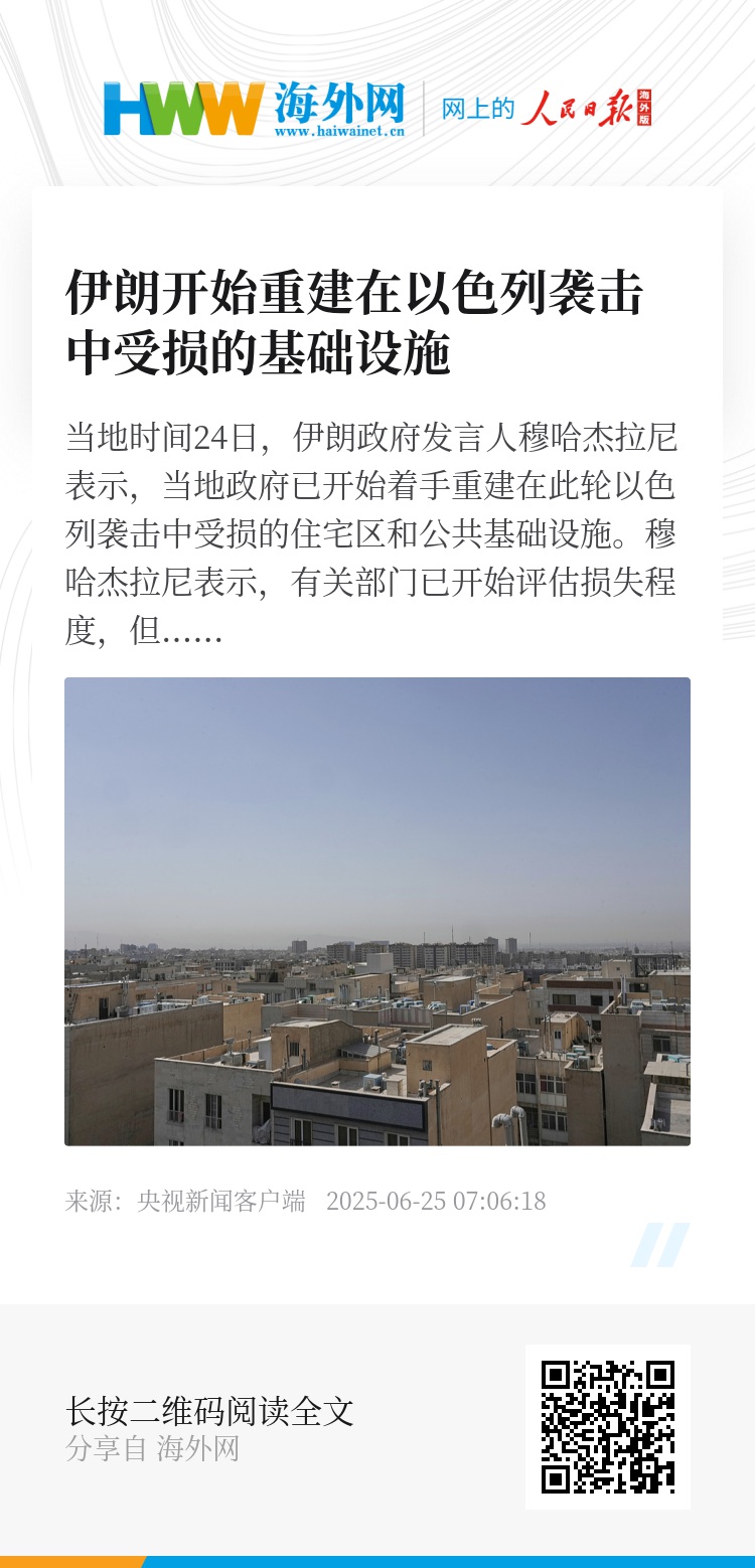 当地时间24日,伊朗政府发言人穆哈杰拉尼表示,当地政府已开始着手重建在此轮以色列袭击中受损的住宅区和公共基础设施。