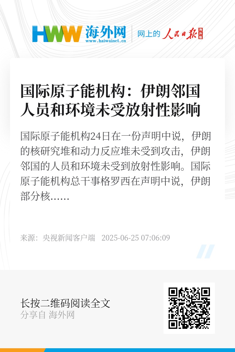 国际原子能机构24日在一份声明中说,伊朗的核研究堆和动力反应堆未受到攻击,伊朗邻国的人员和环境未受到放射性影响。