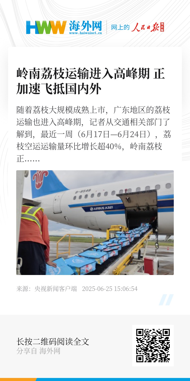 随着荔枝大规模成熟上市,广东地区的荔枝运输也进入高峰期,记者从交通相关部门了解到,最近一周(6月17日—6月24日),荔枝空运运输量环比增长超40%,岭南荔枝正加速飞抵国内外。