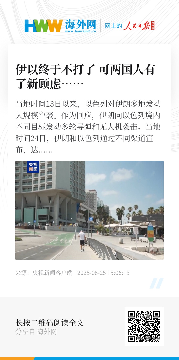 总台驻伊朗记者观察到,当地时间24日晚至25日凌晨,伊朗各地没有再遭到以色列的袭击。但是目前,不少伊朗民众对停火能否持续有疑虑。