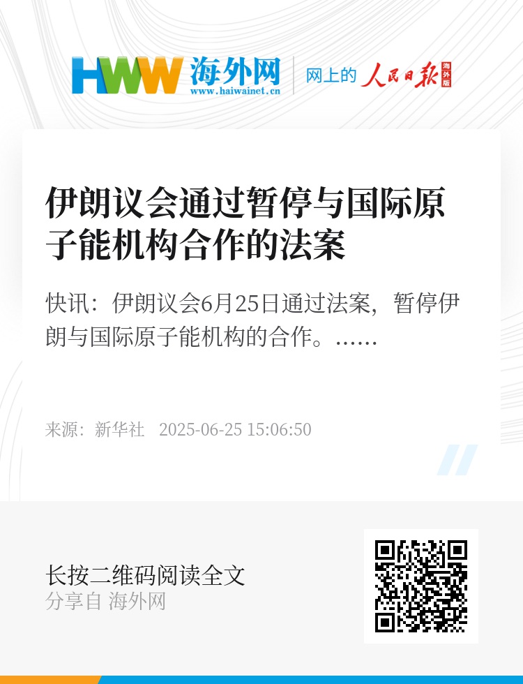 新华社快讯:伊朗议会6月25日通过法案,暂停伊朗与国际原子能机构的合作。