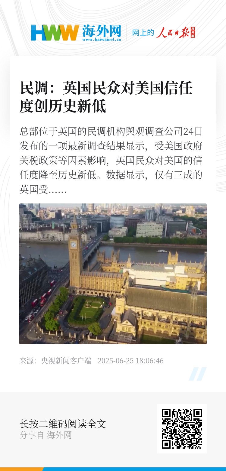 总部位于英国的民调机构舆观调查公司24日发布的一项最新调查结果显示,受美国政府关税政策等因素影响,英国民众对美国的信任度降至历史新低。