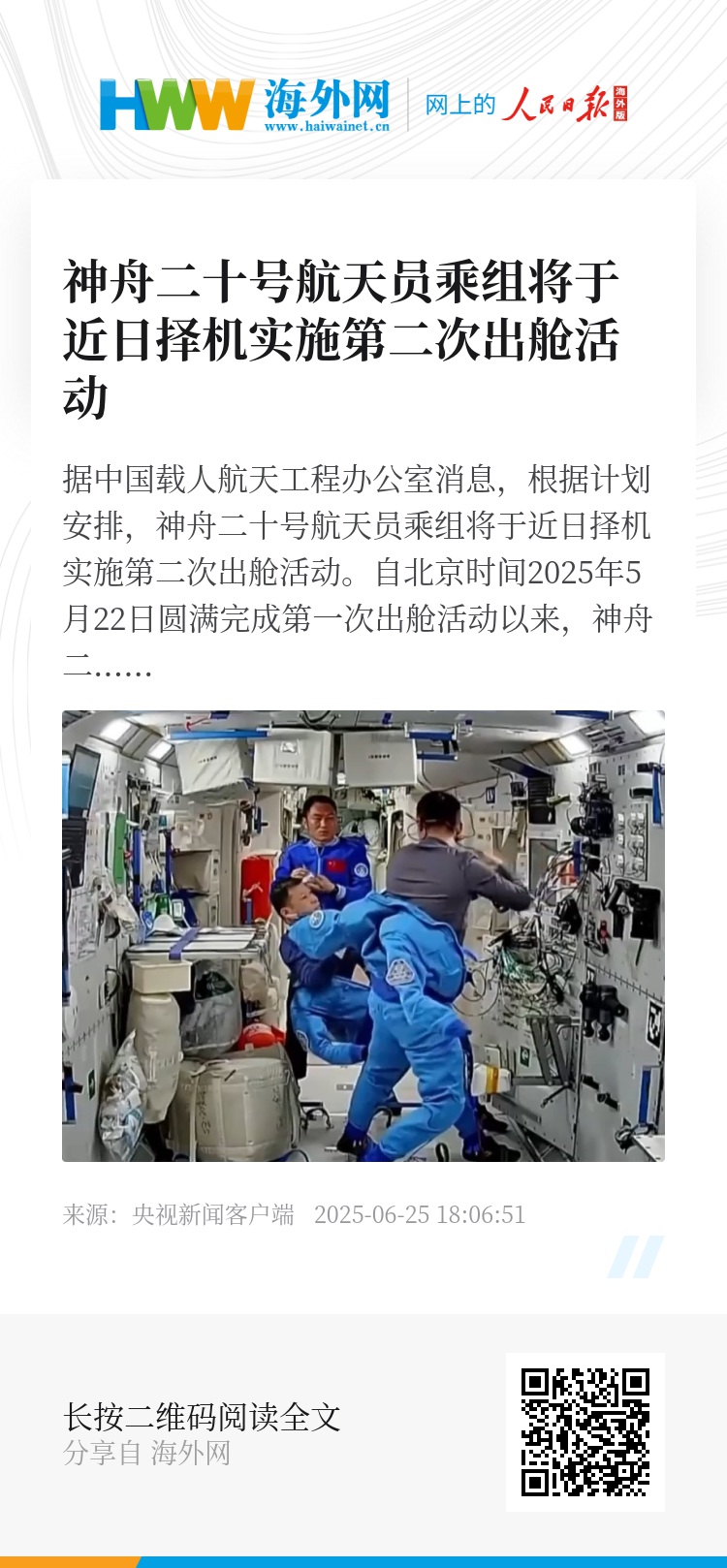 据中国载人航天工程办公室消息,根据计划安排,神舟二十号航天员乘组将于近日择机实施第二次出舱活动。