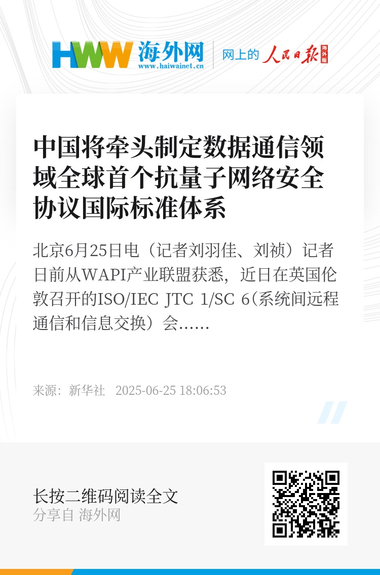 新华社北京6月25日电(记者刘羽佳、刘祯)记者日前从WAPI产业联盟获悉,近日在英国伦敦召开的ISO/IEC JTC 1/SC 6(系统间远程通信和信息交换)会议上,中国专家团队牵头开展的“抗量子攻击的通信网络安全协议设计指南”预备工作项目进展获与会各方一致认可,将进一步牵头制定数据通信领域全球首个抗量子网络安全协议国际标准体系。