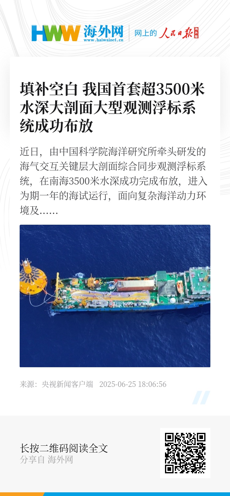近日,由中国科学院海洋研究所牵头研发的海气交互关键层大剖面综合同步观测浮标系统,在南海3500米水深成功完成布放,进入为期一年的海试运行,面向复杂海洋动力环境及高海况背景下的海气通量和海洋-气象水文生态要素开展长期观测和综合同步数据获取,开创了国内外在超3500米水深布放大剖面观测浮标系统的先例。