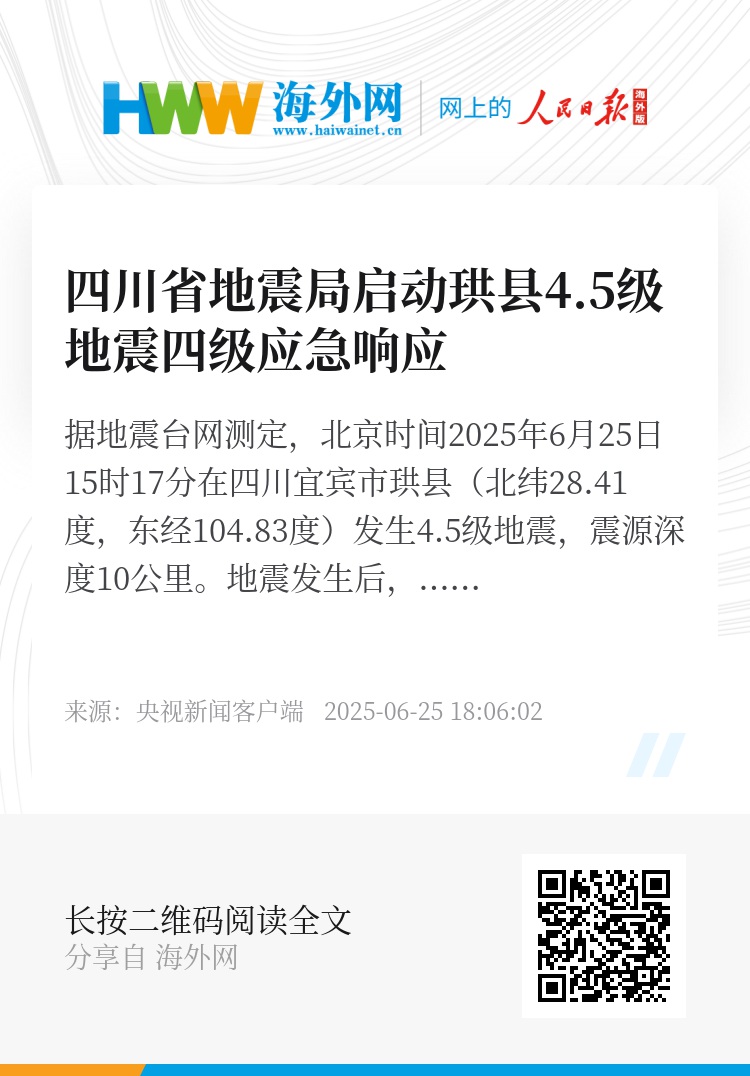 据地震台网测定,北京时间2025年6月25日15时17分在四川宜宾市珙县(北纬28.41度,东经104.83度)发生4.5级地震,震源深度10公里。
