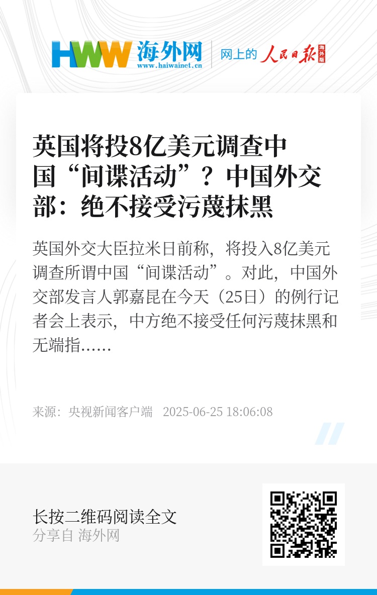 英国外交大臣拉米日前称,将投入8亿美元调查所谓中国“间谍活动”。对此,中国外交部发言人郭嘉昆在今天(25日)的例行记者会上表示,中方绝不接受任何污蔑抹黑和无端指责。