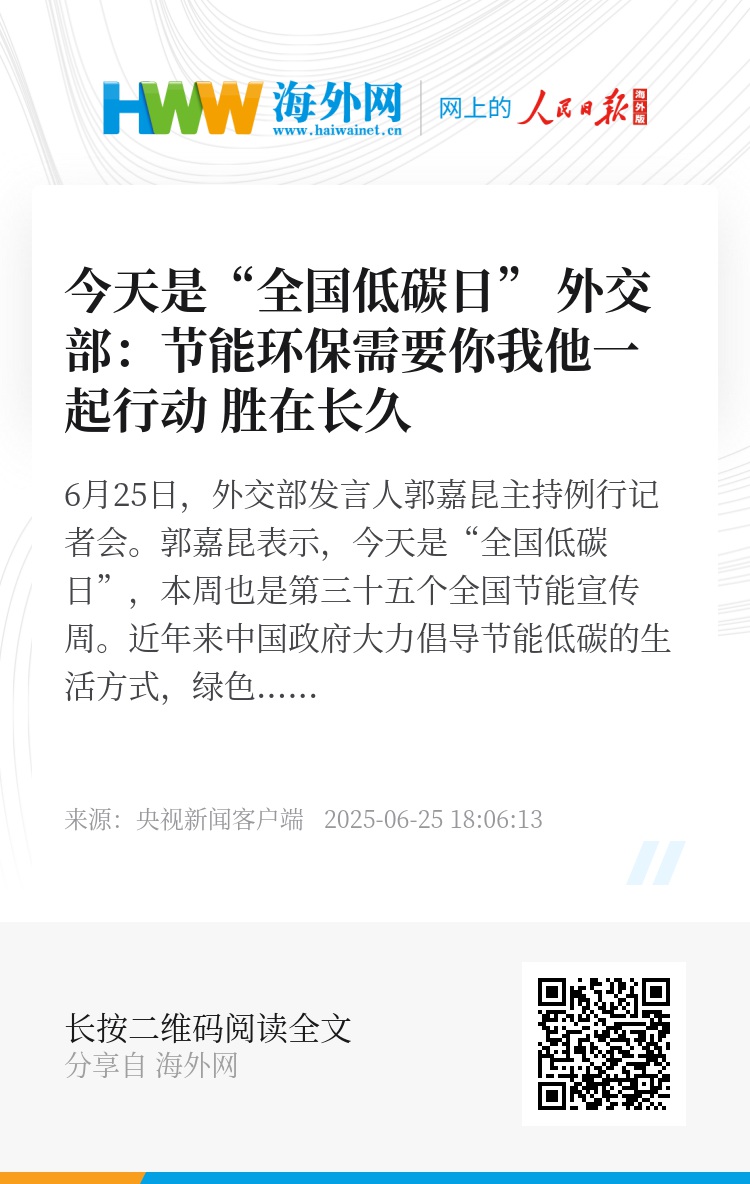 郭嘉昆表示,今天是“全国低碳日”,本周也是第三十五个全国节能宣传周。近年来中国政府大力倡导节能低碳的生活方式,绿色出行、节水节电、光盘行动、垃圾分类已经成为社会风尚,也是外交部的日常规范。节能环保需要你我他一起行动,更需要形成习惯,胜在长久。