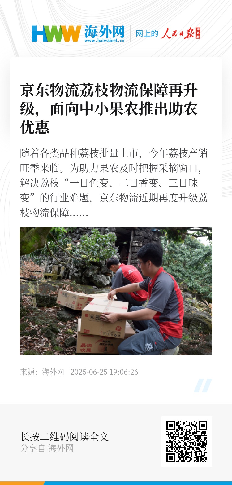 据悉,自2019年大规模进入荔枝产业以来,京东物流已服务超过2万家荔农企业。为帮助果农实现丰产又丰收,今年5月京东启动行业规模最大的助销广东荔枝专项行动。京东物流则通过“产地直采+源头直发+高效物流+全渠道销售”四轮驱动模式,助力荔枝以更低的物流成本,运往全国各地。接下来,京东物流将继续加大荔枝产地投入,在保持价格竞争力的同时,通过多重举措持续助农、惠农。