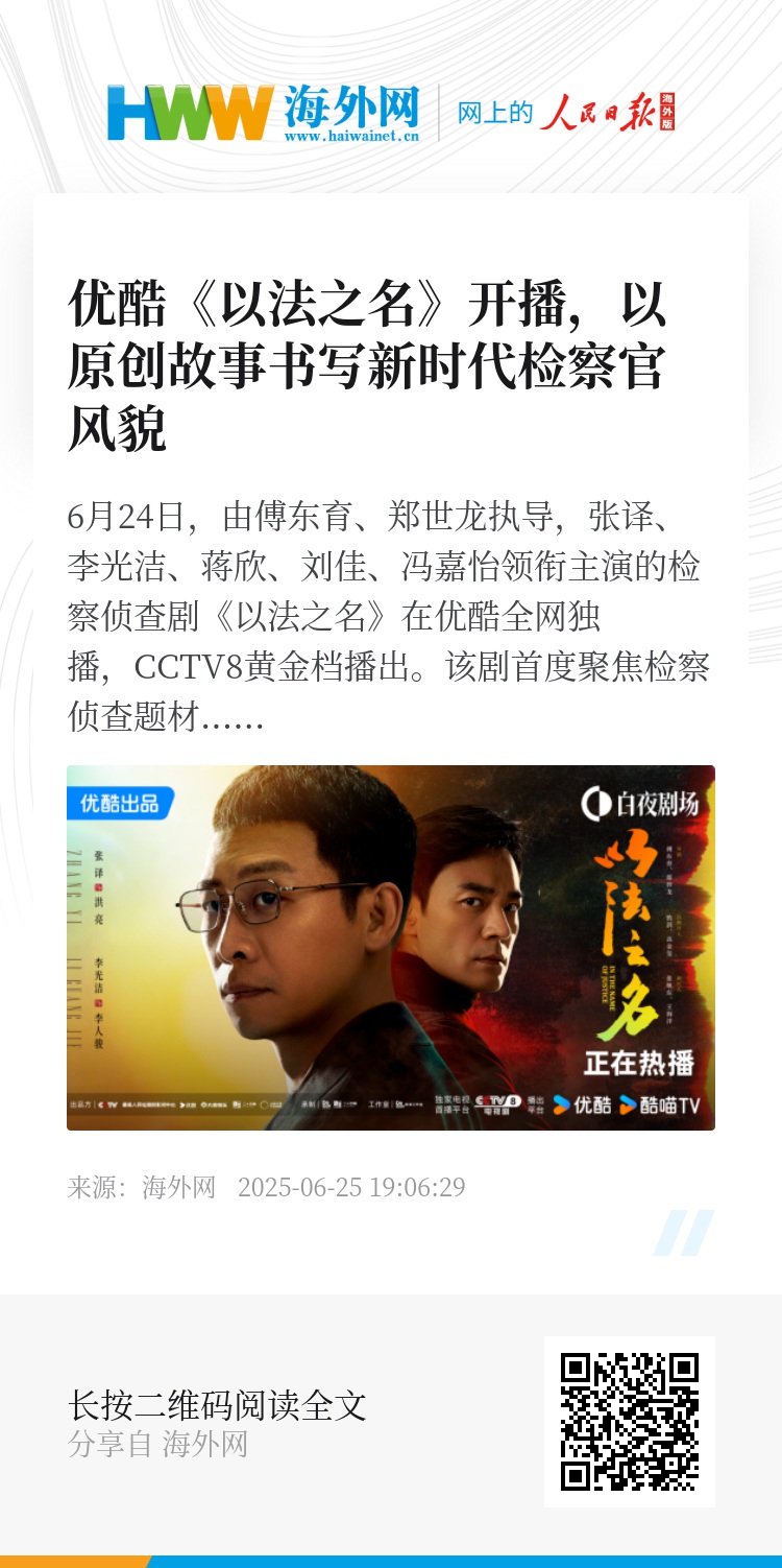 6月24日,由傅东育、郑世龙执导,张译、李光洁、蒋欣、刘佳、冯嘉怡领衔主演的检察侦查剧《以法之名》在优酷全网独播,CCTV8黄金档播出。该剧首度聚焦检察侦查题材,历时三年打磨原创剧本,系优酷白夜剧场“守正系列三部曲”首部大剧。该剧总制片人、虎鲸文娱敦淇工作室总经理敦淇表示,希望通过这部剧能真正让观众感受到,公正司法是维护社会公平正义的最后一道防线。