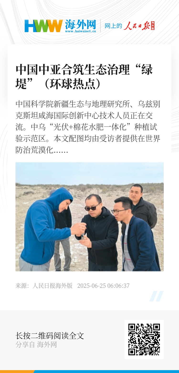 在近日召开的第二届中国—中亚峰会上,中国同中亚五国发布阿斯塔纳宣言称,各方愿推动在荒漠化土地和盐碱地治理开发、节水灌溉、病虫害防治、畜牧兽医等领域开展技术与人才交流合作,增强农业系统可持续发展韧性。咸海国际创新中心主任哈比布拉耶夫认为:“中国在沙漠化防治、节水农业等领域积累了先进的技术和丰硕的成果。希望未来各方加强合作,推动中亚地区的生态治理继续走深走实。”