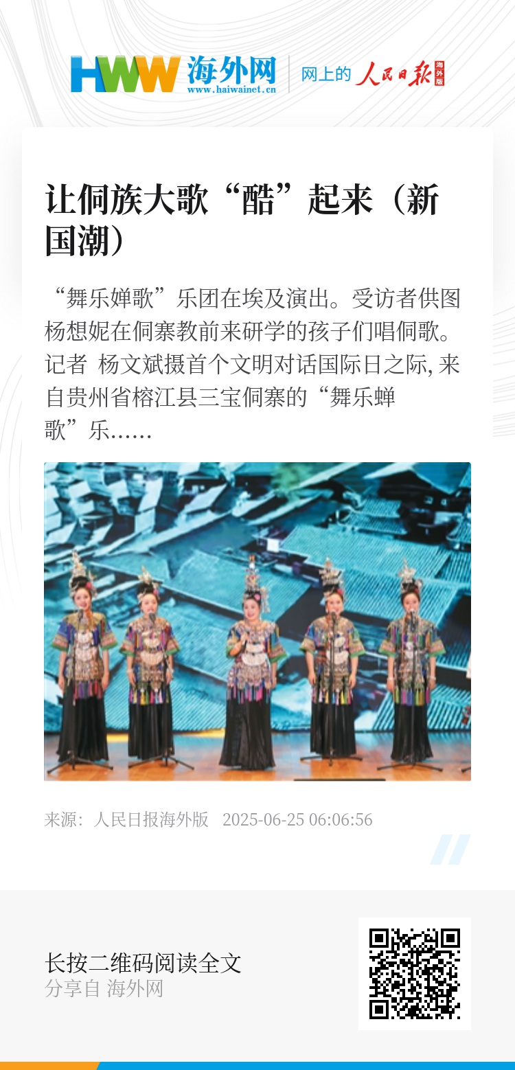这次在埃及开罗的演出,他们不仅演唱传统的侗族大歌,也演唱改编后的侗族大歌,还与埃及歌者对歌互动。“我们想让海外观众了解到,我们民族的音乐是与时俱进的,是可以和世界对话的。”杨想妮说。