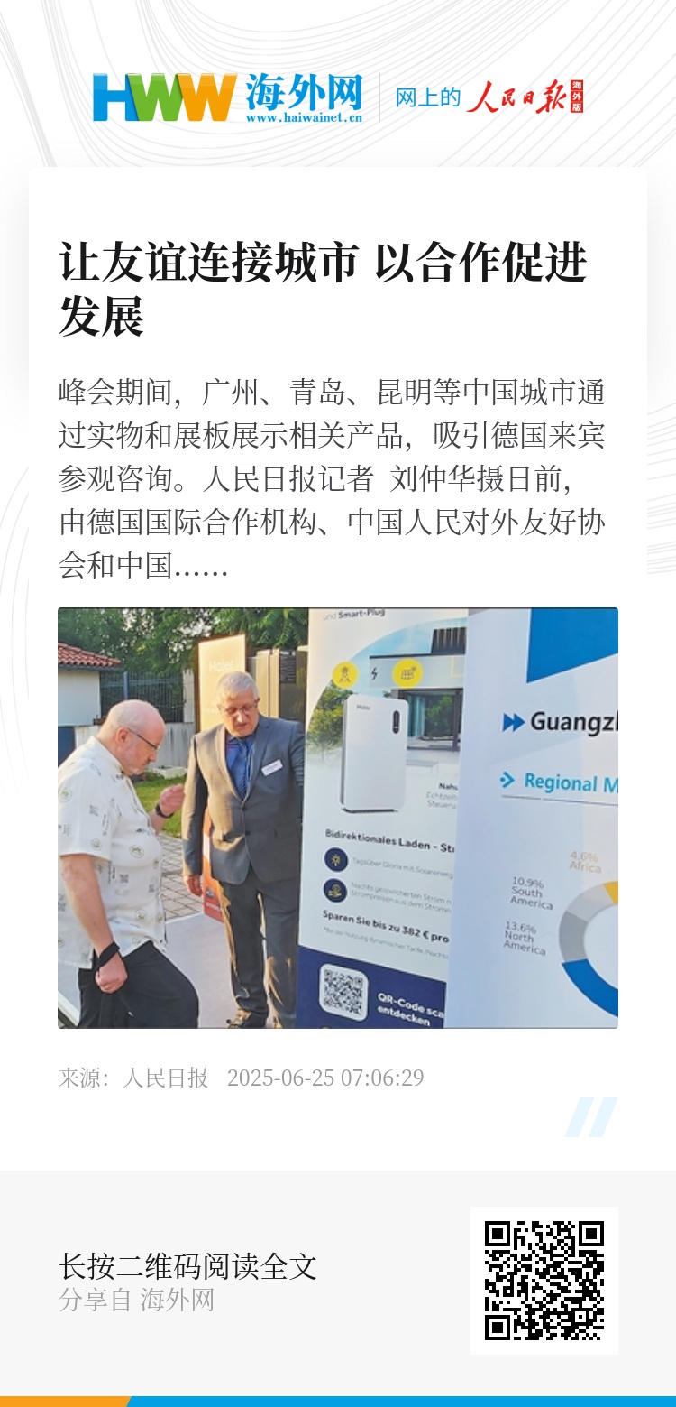 “中国是德国极为重要的贸易伙伴,是充满活力和创新创业精神的市场,对德国中小企业来说举足轻重。中国也为德国带来投资与技术支持,助力德国经济增长与多元化发展。这种互利共赢的关系为两国创造了就业机会,推动了创新和繁荣。”德国中小企业联合会执行董事安德烈亚斯·耶恩说,友城合作成为两国紧密合作关系的证明。