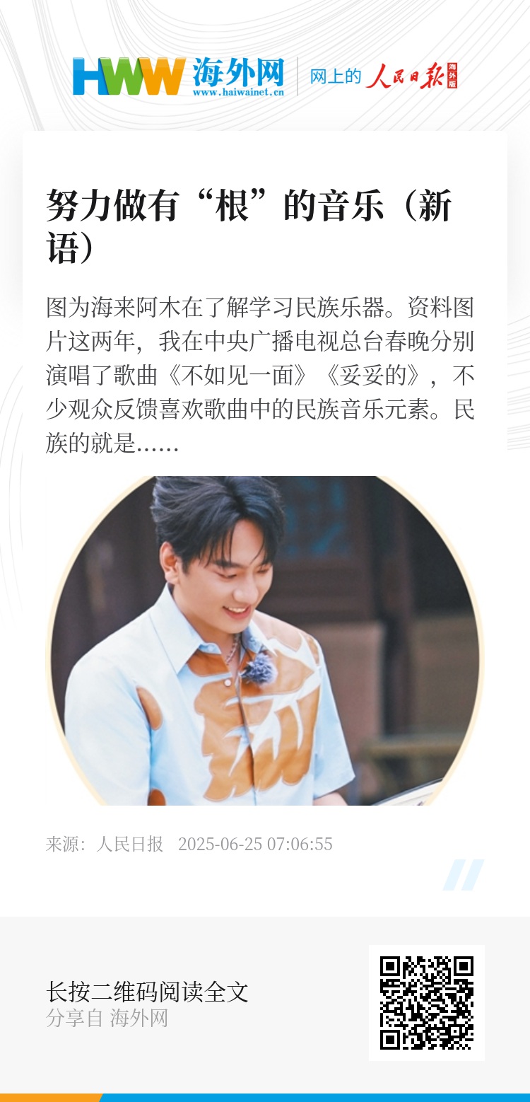 这两年,我在中央广播电视总台春晚分别演唱了歌曲《不如见一面》《妥妥的》,不少观众反馈喜欢歌曲中的民族音乐元素。民族的就是世界的,传统的也是时尚的。努力做有“根”的音乐,让传统音乐长出时代的翅膀,这也是很多音乐人的梦想。