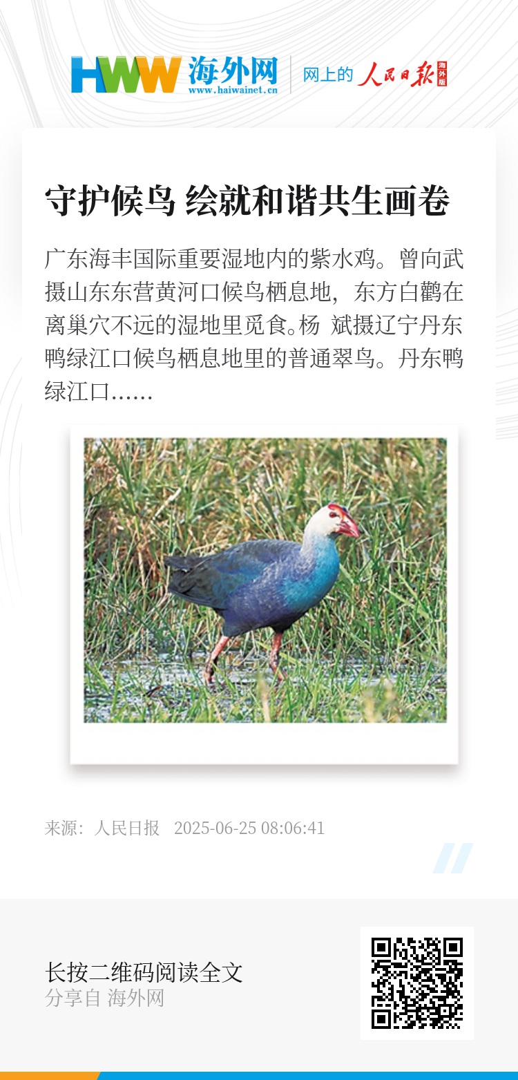 “这是我最喜欢的一种水鸟。”曾向武告诉记者,紫水鸡是湿地留鸟,生活在湿地植物水葱和附近的稻田里。它们的羽毛蓝紫相间,并带有闪光的绿色,非常漂亮,被誉为“最美水鸟”。