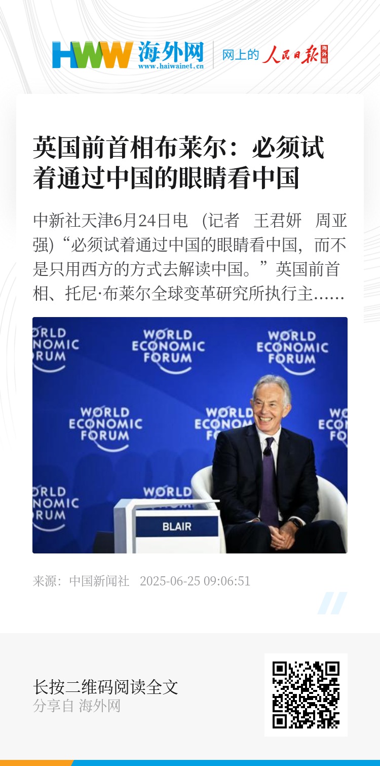 中新社天津6月24日电 (记者 王君妍 周亚强)“必须试着通过中国的眼睛看中国,而不是只用西方的方式去解读中国。”英国前首相、托尼·布莱尔全球变革研究所执行主席托尼·布莱尔(Tony Blair)24日在天津出席世界经济论坛2025年新领军者年会(第十六届夏季达沃斯论坛)的对话会时表示,理解中国不能仅停留在西方视角,更需要加深人文交流与现实接触。