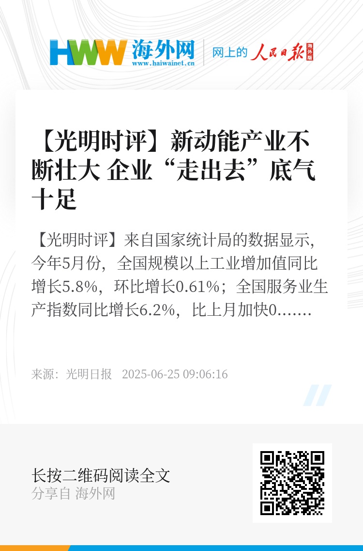 来自国家统计局的数据显示,今年5月份,全国规模以上工业增加值同比增长5.8%,环比增长0.61%;全国服务业生产指数同比增长6.2%,比上月加快0.2个百分点;社会消费品零售总额同比增长6.4%,消费品以旧换新政策持续显效……亮眼的数据不仅展现出中国经济的韧性,而且反映了新动能产业的不断壮大,为中国产业加快融入国际市场提供了有力支撑。
