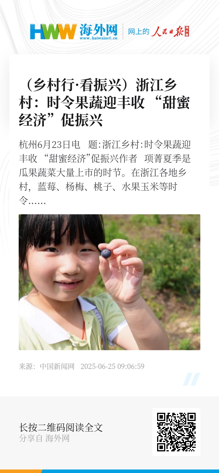 中新网杭州6月23日电 题:浙江乡村:时令果蔬迎丰收 “甜蜜经济”促振兴