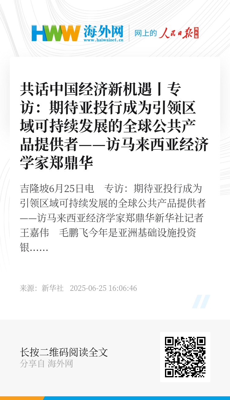 新华社吉隆坡6月25日电 专访:期待亚投行成为引领区域可持续发展的全球公共产品提供者——访马来西亚经济学家郑鼎华