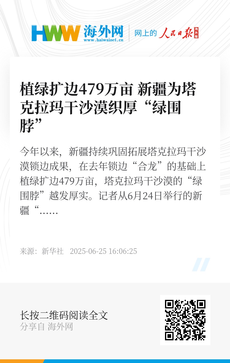 今年以来,新疆持续巩固拓展塔克拉玛干沙漠锁边成果,在去年锁边“合龙”的基础上植绿扩边479万亩,塔克拉玛干沙漠的“绿围脖”越发厚实。