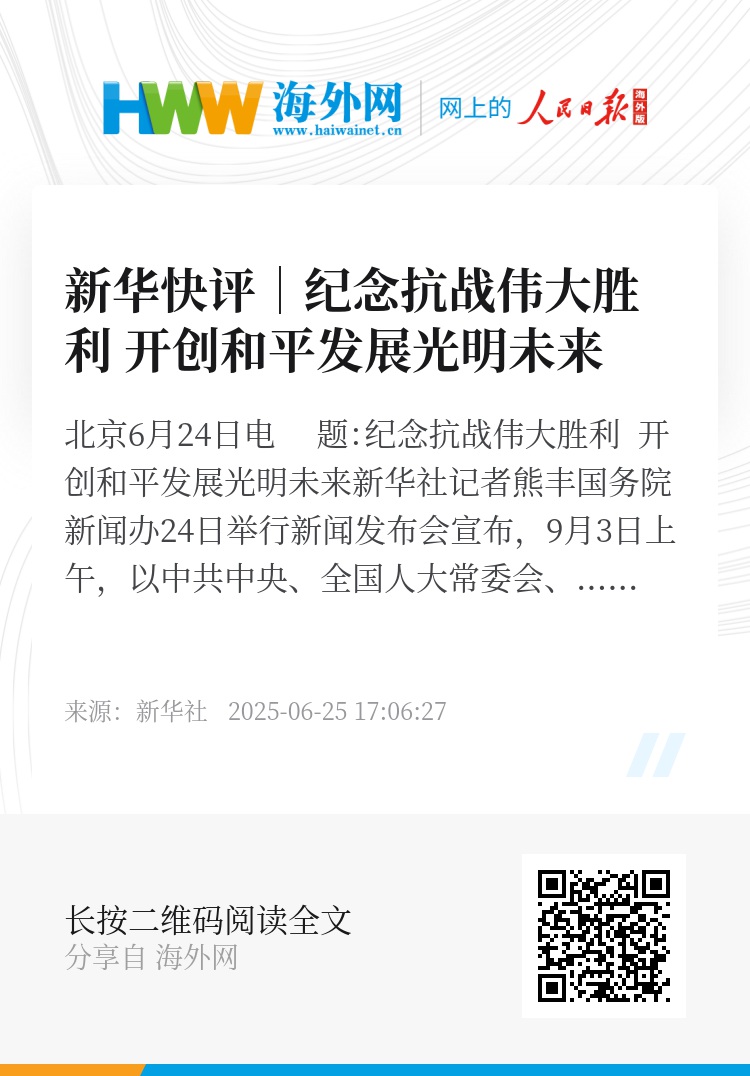 回望烽火岁月,伟大抗战精神永放光芒;展望美好未来,和平发展决心坚如磐石。从历史中汲取前行的智慧和力量,开创更加光明的未来,让我们从纪念活动中凝聚力量,肩负起新的历史使命,把强国建设、民族复兴伟业不断推向前进,共同推动构建一个持久和平、共同繁荣的世界。