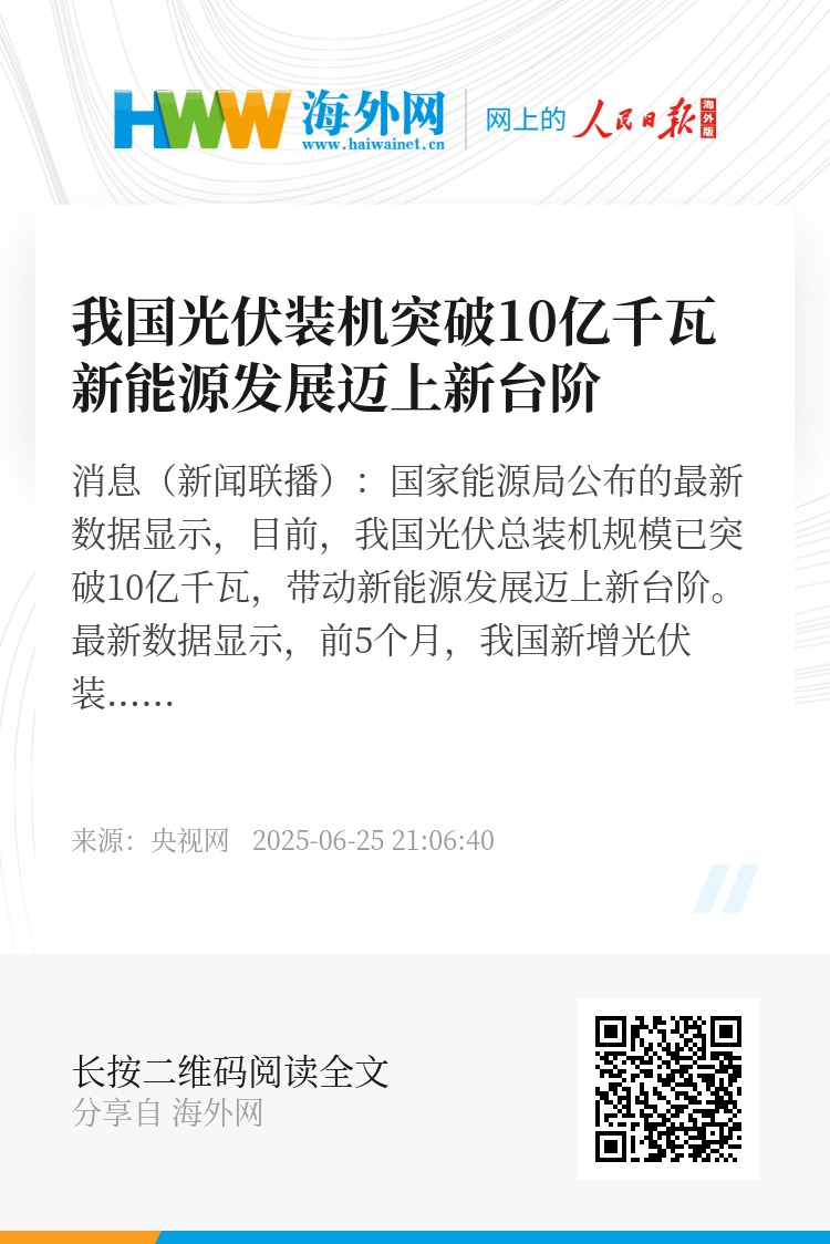 央视网消息(新闻联播):国家能源局公布的最新数据显示,目前,我国光伏总装机规模已突破10亿千瓦,带动新能源发展迈上新台阶。