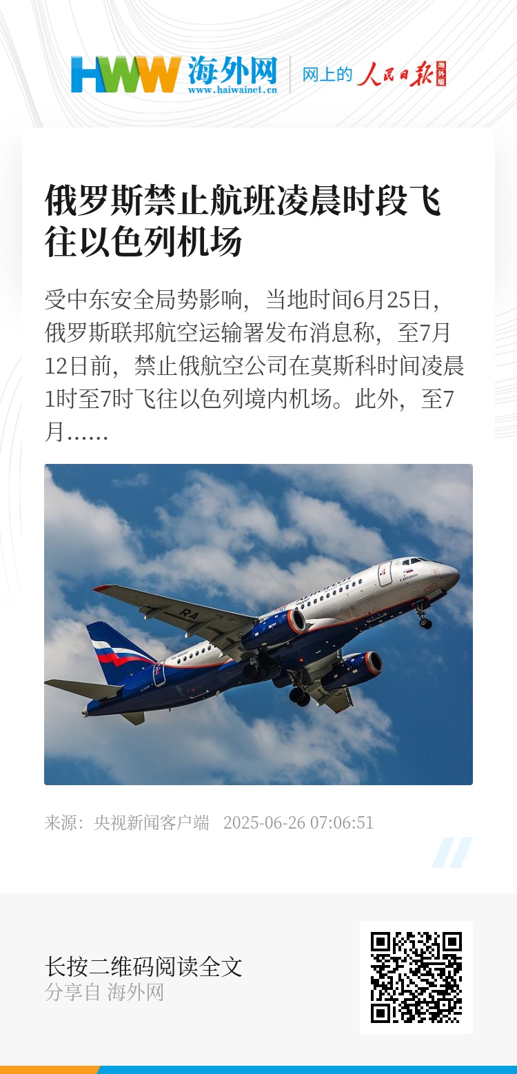 受中东安全局势影响,当地时间6月25日,俄罗斯联邦航空运输署发布消息称,至7月12日前,禁止俄航空公司在莫斯科时间凌晨1时至7时飞往以色列境内机场。此外,至7月4日前,还禁止俄航空公司航班在约旦、伊拉克和伊朗空域飞行。(总台记者 张誉耀)