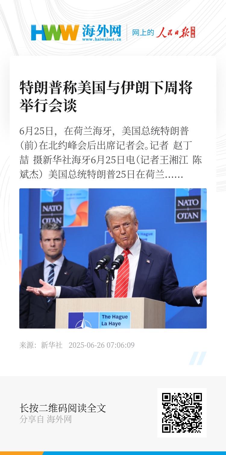 新华社海牙6月25日电(记者王湘江 陈斌杰)美国总统特朗普25日在荷兰海牙出席北约峰会后举行记者会,称美国与伊朗下周将举行会谈,并可能签署一项协议。
