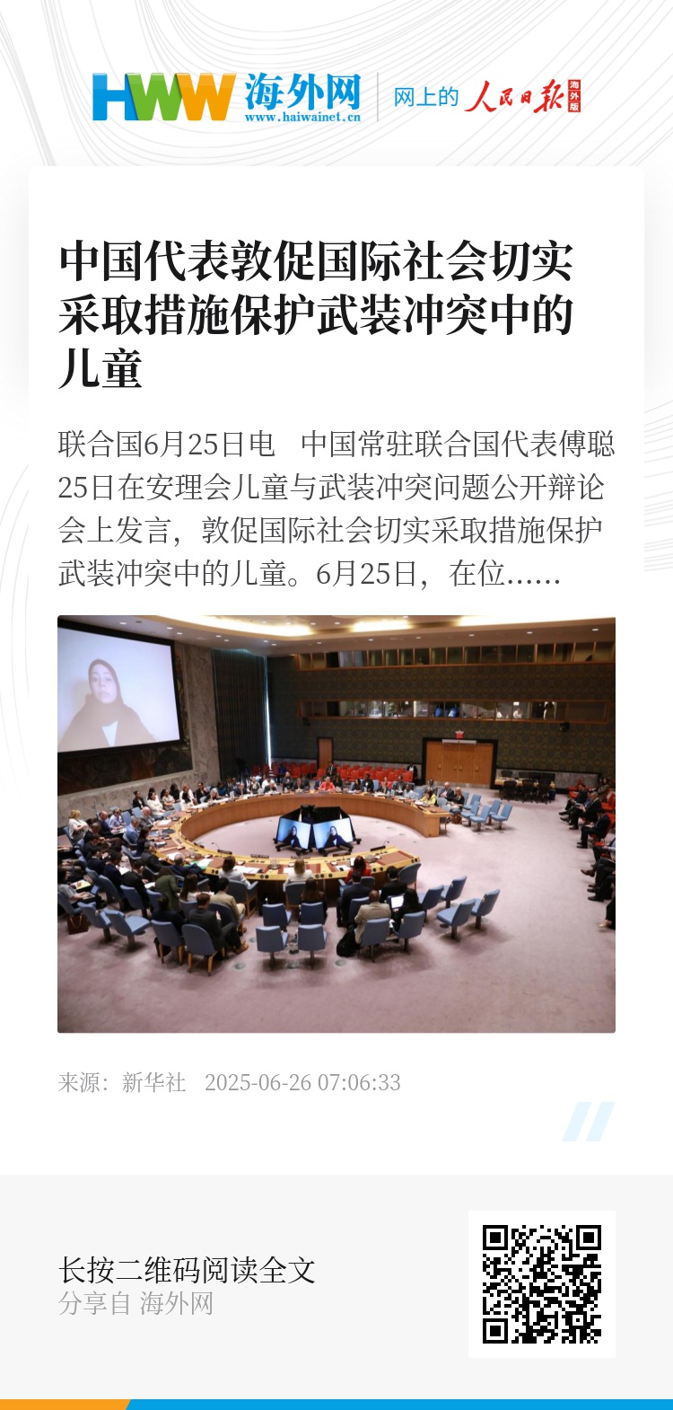 新华社联合国6月25日电 中国常驻联合国代表傅聪25日在安理会儿童与武装冲突问题公开辩论会上发言,敦促国际社会切实采取措施保护武装冲突中的儿童。