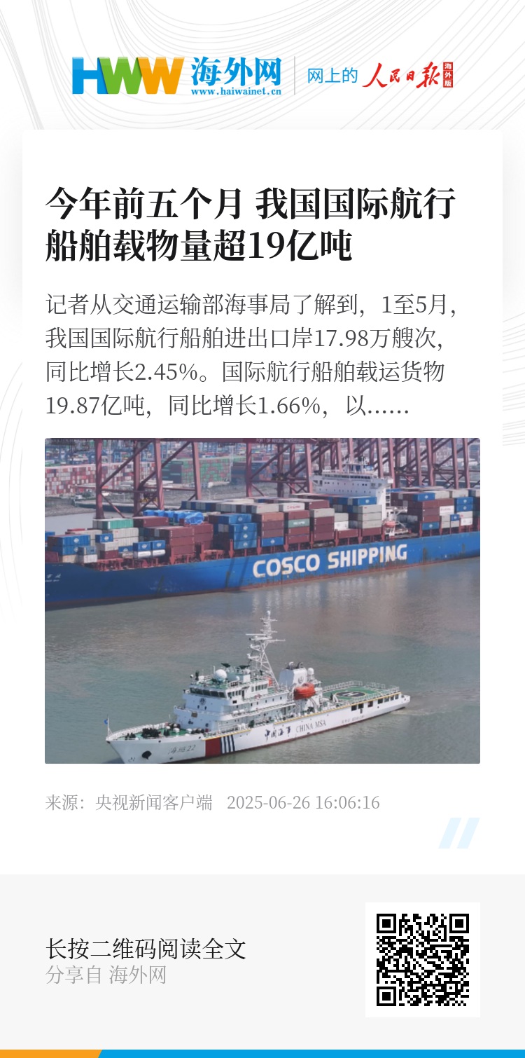 记者从交通运输部海事局了解到,1至5月,我国国际航行船舶进出口岸17.98万艘次,同比增长2.45%。国际航行船舶载运货物19.87亿吨,同比增长1.66%,以大宗散货、能源物资、集装箱货物为主。我国外贸水上运输领域持续展现出强劲的活力,国际航运量稳步攀升。