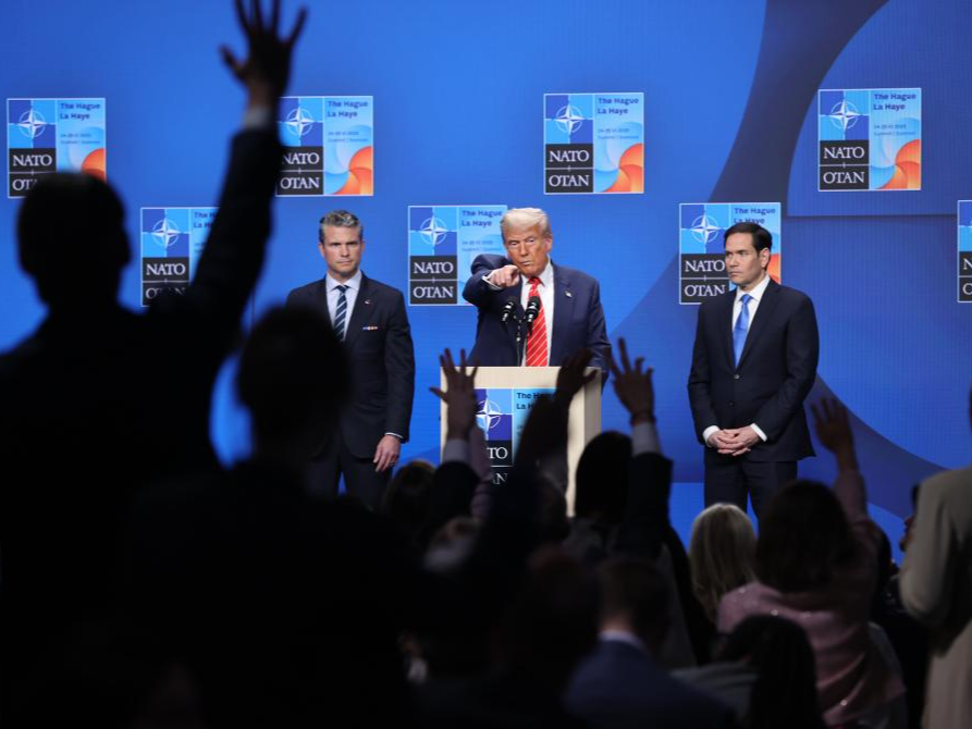 6月25日,在荷兰海牙,美国总统特朗普(中)在北约峰会后出席记者会。新华社记者赵丁喆摄