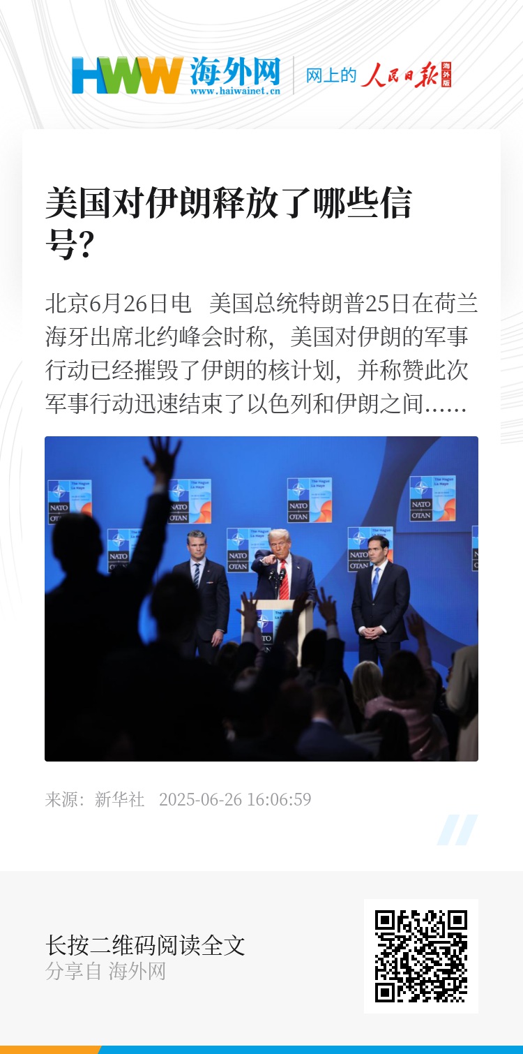 新华社北京6月26日电 美国总统特朗普25日在荷兰海牙出席北约峰会时称,美国对伊朗的军事行动已经摧毁了伊朗的核计划,并称赞此次军事行动迅速结束了以色列和伊朗之间的冲突。同日,特朗普透露,美国与伊朗下周将举行会谈,并暗示可能放松对伊朗制裁。