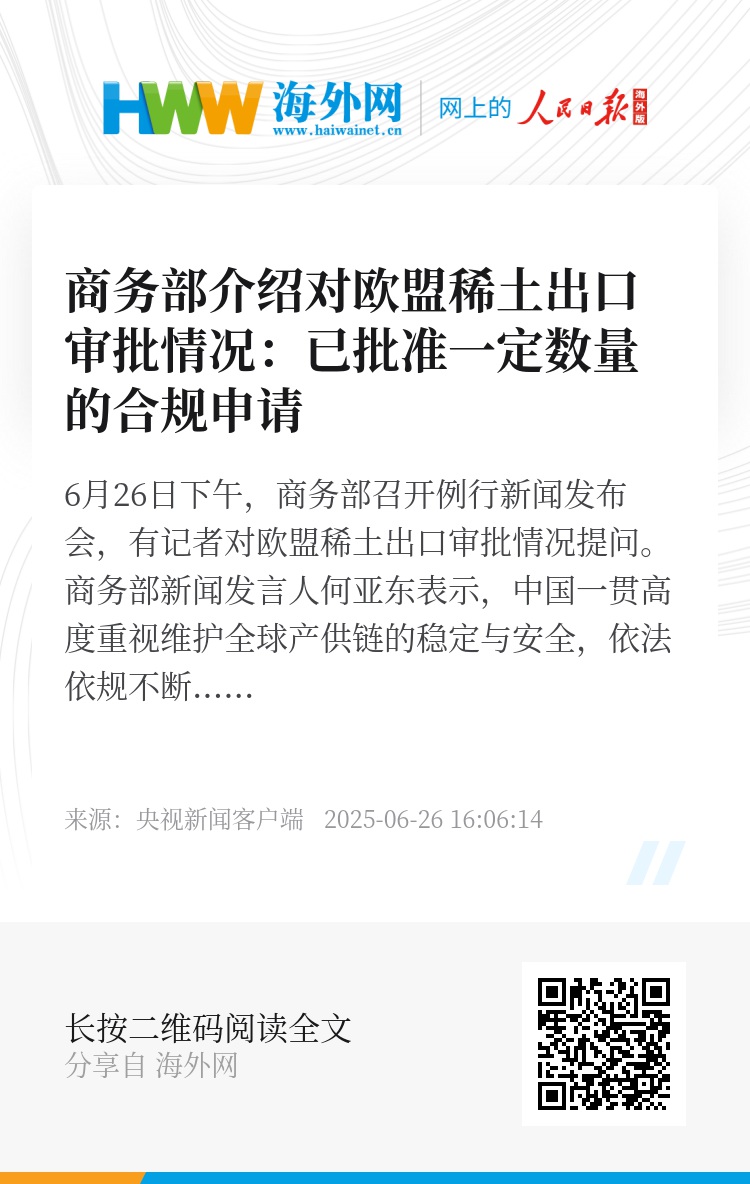 6月26日下午,商务部召开例行新闻发布会,有记者对欧盟稀土出口审批情况提问。
