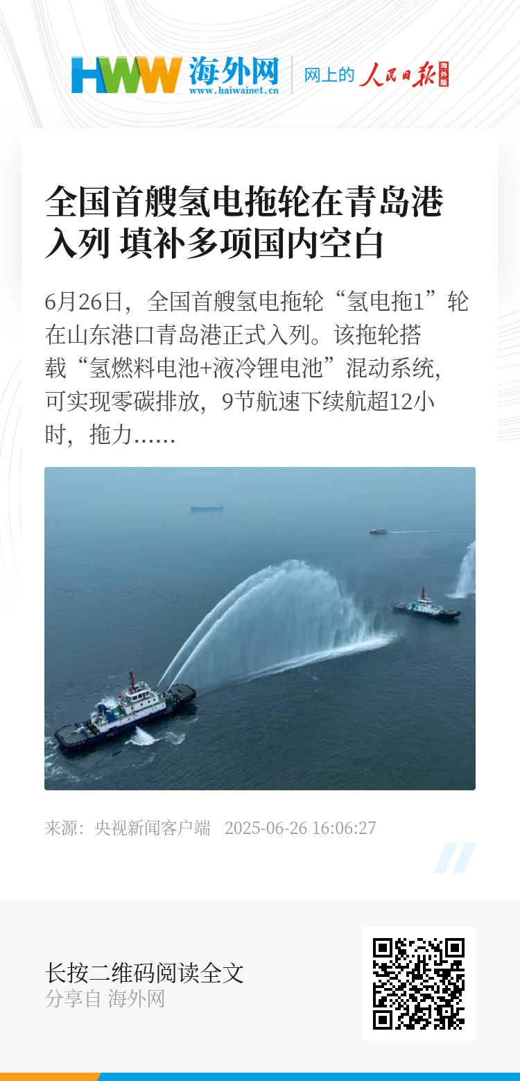 6月26日,全国首艘氢电拖轮“氢电拖1”轮在山东港口青岛港正式入列。