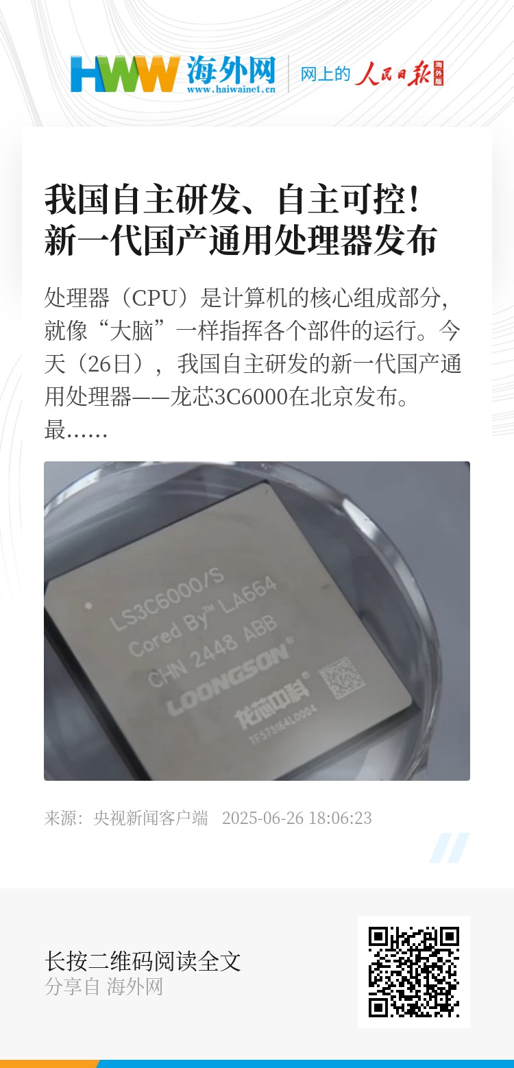 处理器(CPU)是计算机的核心组成部分,就像“大脑”一样指挥各个部件的运行。今天(26日),我国自主研发的新一代国产通用处理器——龙芯3C6000在北京发布。