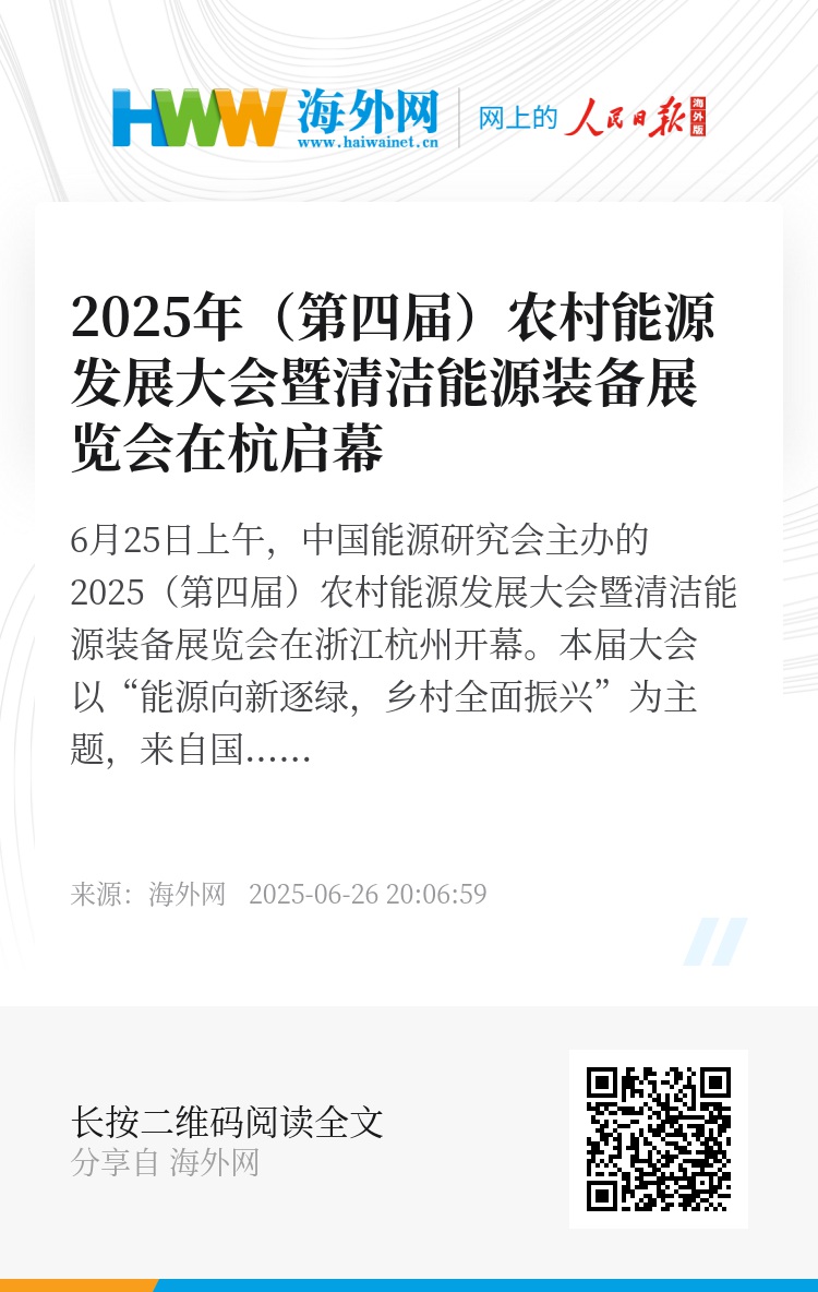 6月25日上午,中国能源研究会主办的2025(第四届)农村能源发展大会暨清洁能源装备展览会在浙江杭州开幕。本届大会以“能源向新逐绿,乡村全面振兴”为主题,来自国家能源局、农业农村部等部委领导,能源产业领域的专家、学者、企业家共900余位嘉宾代表,共同探讨农村能源转型、县域能源发展以及能源赋能乡村全面振兴的新思路、新技术和新经验。