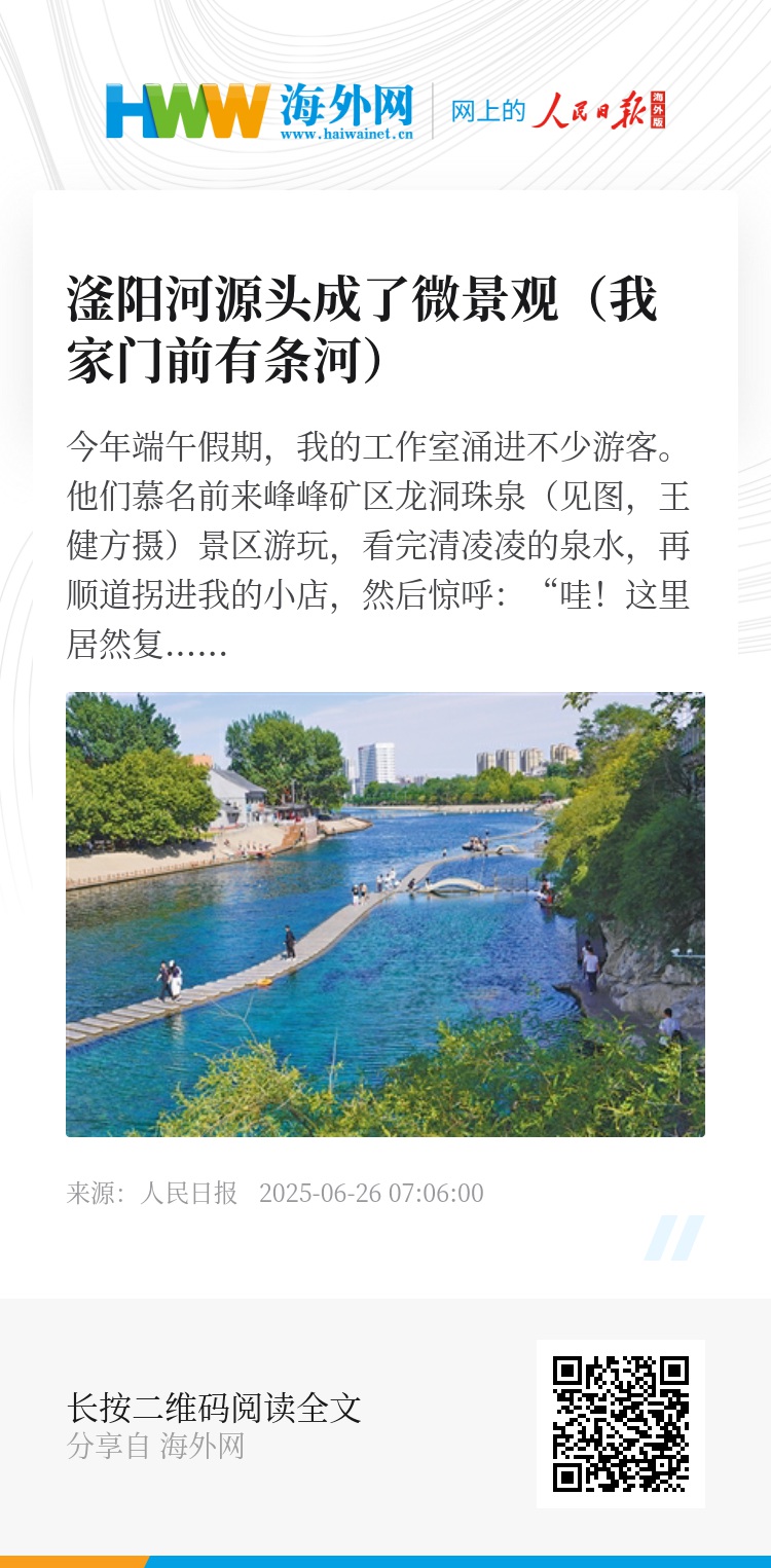 父亲告诉我,近几年,峰峰矿区加大力度开展滏阳河源头综合治理,龙洞珠泉冒出来的泉水越发清澈。不少网友分享着各个角度的泉水美景,把这里叫做“玻璃海”。我看得心潮澎湃,也更加思念家乡和亲人,谋划着要回乡创业,把时常出现在梦里的景观变成现实。